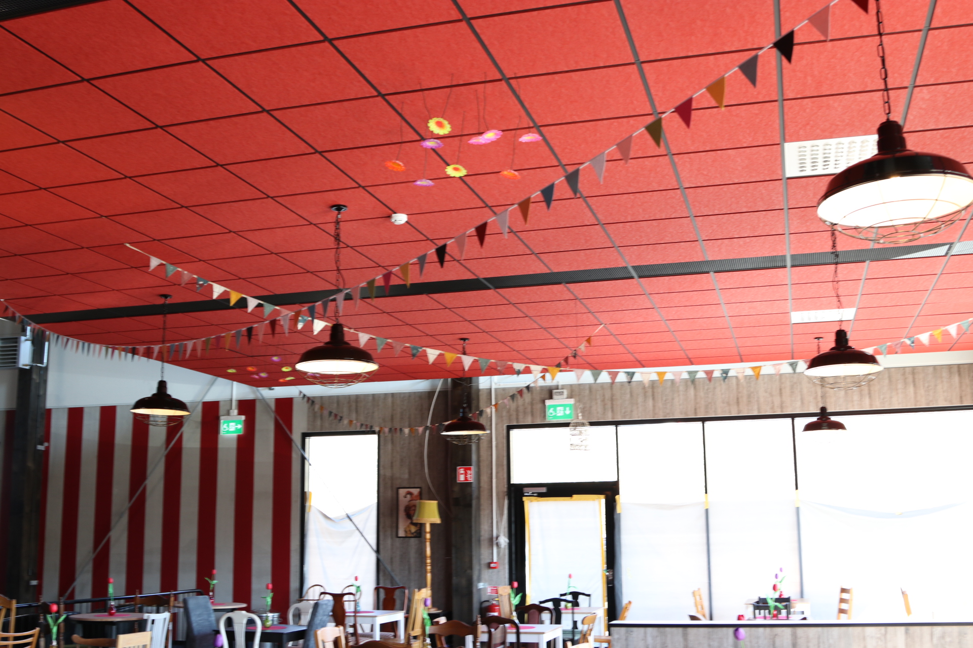 Vi arbetar med helhetslösningar när det gäller akustik och ljudmiljö. Där undertaket kompletteras med ljudabsorbenter som är noga utvalda att passa till vad lokalen ska användas till. I detta fallet var det en skolmatsal med högt till tak, då det är extra viktigt att komplettera med väggabsorbenter.