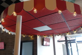 Vi har monterat undertak och väggabsorbenter i en skolmatsal som helrenoverades. För att ljudmiljön ska bli bra i en skolmatsal så kompletterar vi med väggabsorbenter till undertaket. I undertaket har det monterats belysning med ledpaneler som är anpassade till undertaket.